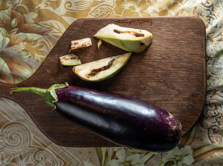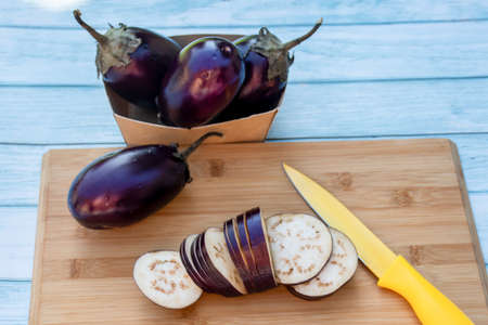 Sliced eggplant on wooden cutting board. Preparation for cooking ratatouille or stew.