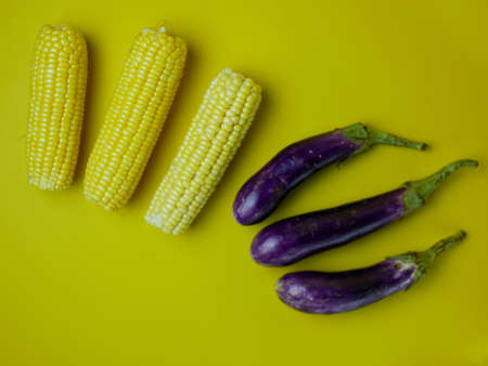 Corn and eggplant isolated on a yellow background. for the concept of healthy food and vegetables. flat lay look