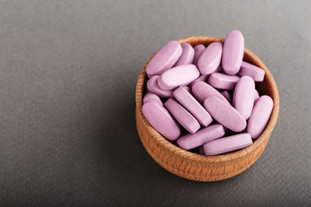 large pink pills in a wooden plate on a black background