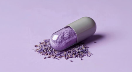 A single open capsule filled with purple powder, with some powder spilled around it, isolated on a plain white background.
