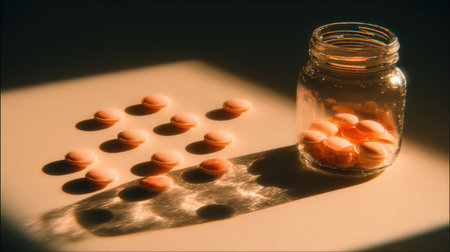 Pink pills spilling from a glass jar onto a beige surface, illuminated by dramatic lighting that casts long shadows, creating a striking still life composition. Generative ai