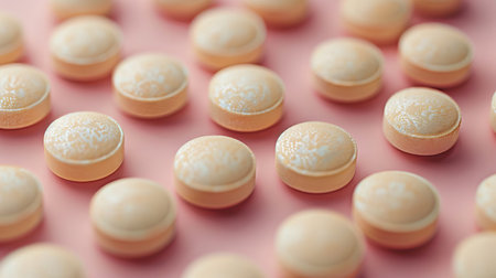 large pink tablets scattered on a green background. treatment of vitamin deficiency with vitamins
