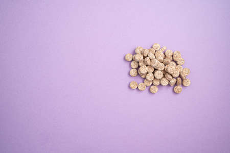Empty pack with white pills packed in blister with copy space on purple background. Focus on foreground, soft bokeh.