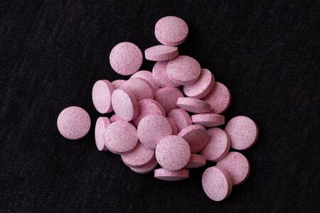 Heap of pills tablets medicine lying isolated on black background extreme close-up macro.