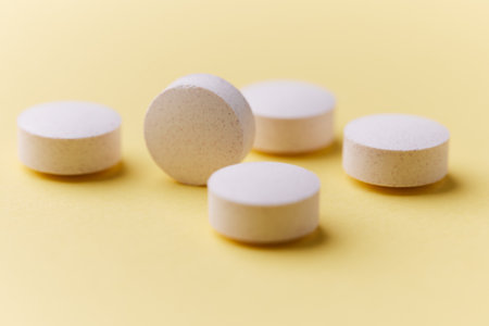 White pills on a yellow background. Focus on foreground, soft bokeh.