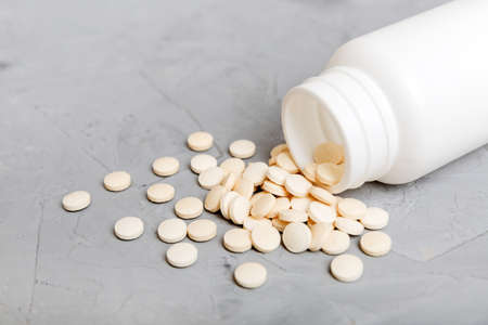 white pills are scattered from the bottle on the table. tablet on the table.