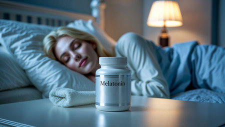 container with capsules, inscription melatonin, a girl is sleeping in the background