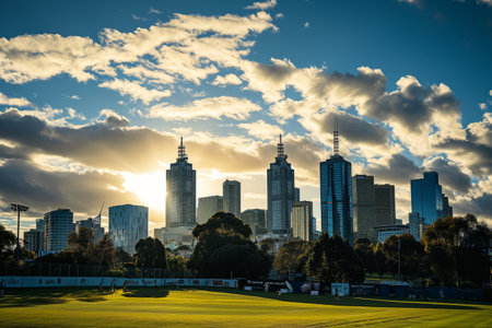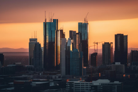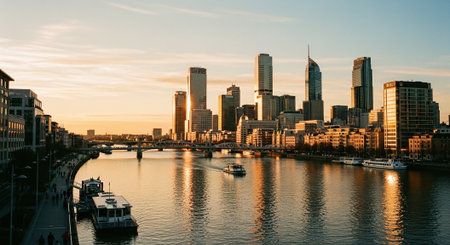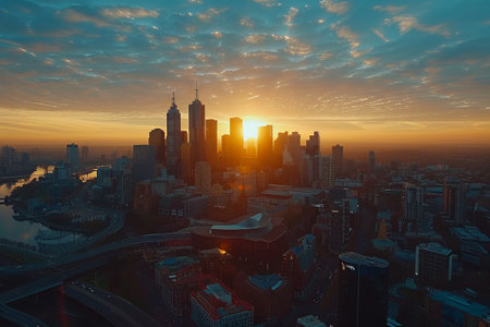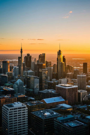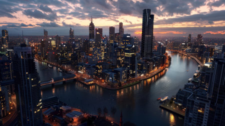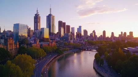 Experience the breathtaking beauty of Melbourne's skyline at sunset, casting vibrant colors over the river. This aerial view showcases the city's dynamic architecture, reflecting a perfect blend of urban life and nature.