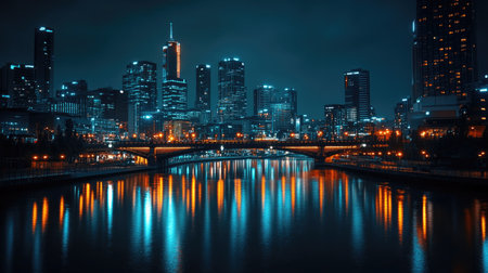 A city skyline with a river running through it. The city is lit up at night, creating a warm and inviting atmosphere