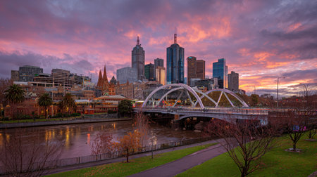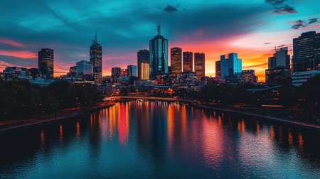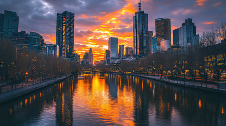 As the sun sets, the Melbourne skyline glows with vibrant colors, casting reflections on the calm waters of the Yarra River, creating a stunning urban landscape.