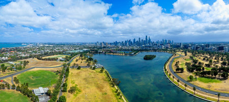 MELBOURNE, AUSTRALIA - DECEMBER 30, 2019: An aerial view of Albert Park Lake and the surrounding parkl ands. The image shows the public roads (Lakeside Drive) that are utilized annually as the Formula 1 Grand Prix race circuit.