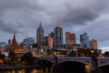 Melbourne, Australia - April 1, 2022: Cloudy dusk view of Princes Bridge and Melbourne CBD skyline