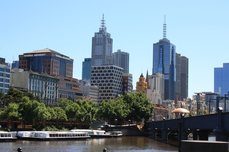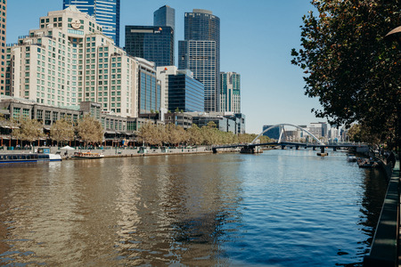 Panoramic view of Melbourne skyline taken from a bridge over the Yarra river