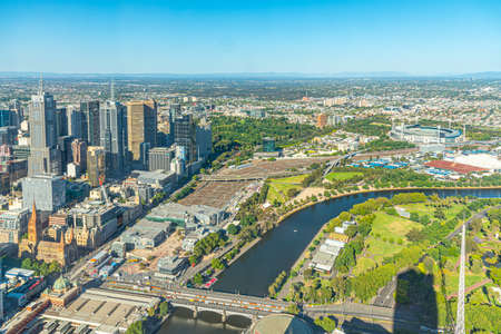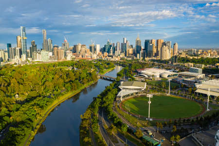 MELBOURNE, AUSTRALIA, JANUARY 1, 2020: Aerial view sport stadiums and downtown Melbourne behind Yarra river, Australia