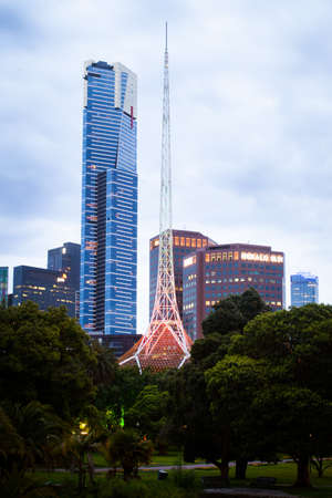 Melbourne, Australia - December 20 - Melbourne's famous Arts Centre and Eureka Tower from Alexandra Gardens at dusk on December 20th 2013.