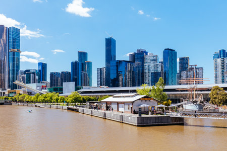 Melbourne, AUSTRALIA - March, 9 2017: South Wharf suburb cityscape from Yarra River in the city center of Melbourne on March 9, 2017.