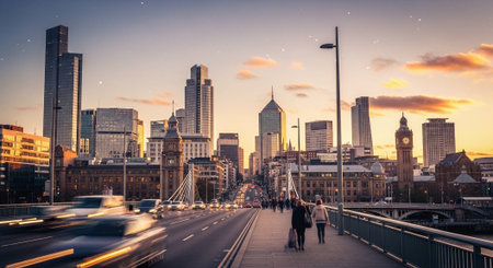 A bustling city skyline at sunset with modern skyscrapers and historic buildings, people walking on a bridge, cars passing by, warm colors in the sky