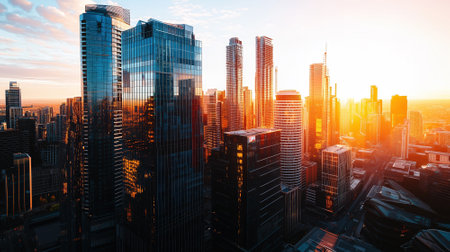 A city skyline at sunset with tall skyscrapers reflecting golden light, urban setting, modern architecture