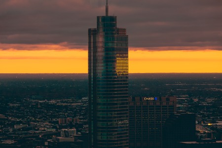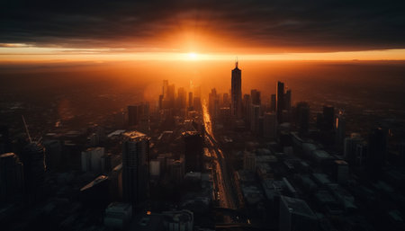 skyscraper at dusk, with the sun setting over the city skyline, created with generative ai