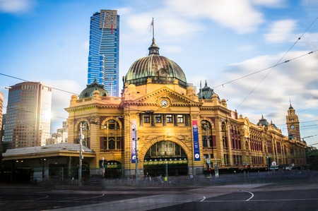 Melbourne's iconic Flinders Street station with Eureka tower in the background in afternoon light.