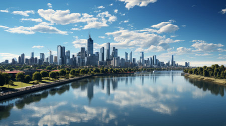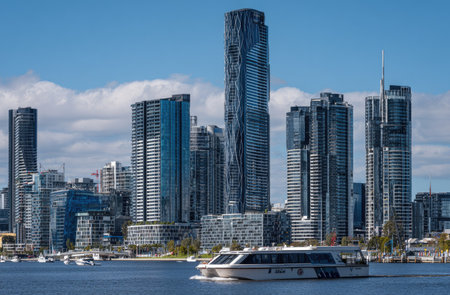 A boat navigates the water in front of a modern city skyline. Several tall skyscrapers feature glass facades against a clear blue sky. The composition includes a prominent foreground element and is illuminated by natural daylight, ideal for commercial visual projects.