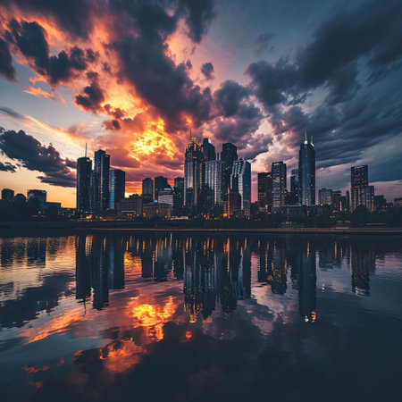 A stunning sunset scene over Melbourne's skyline reflects beautifully on the calm river. The vibrant colors of the twilight sky create a tranquil atmosphere, perfect for capturing the essence of urban beauty.