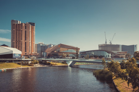 Adelaide, Australia - January 13, 2017: Adelaide city skyline with its iconic buildings viewed across Torrens river in Elder Park on a bright day