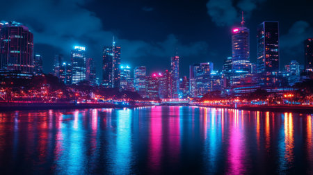 A modern city skyline illuminated at night with colorful lights reflecting in the water, showing vibrant urban life