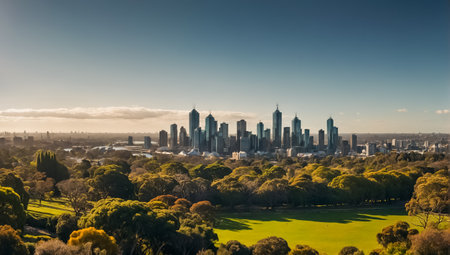 Melbourne cityscape with tall green trees and palm trees on sunny day
