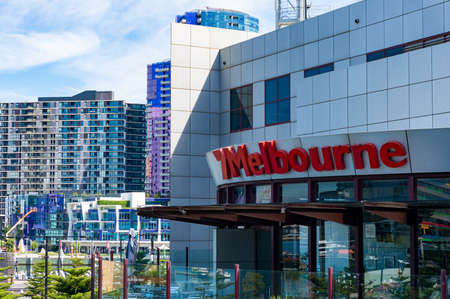 Melbourne, Australia - November 16, 2009: Closeup of marquee with name in big characters of Convention and Exhibition Centre downtown against silver sky.