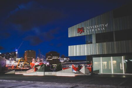 HOBART, TASMANIA AUSTRALIA - November 8th, 2019: view of Hobart harbour and the University of Tasmania building at night