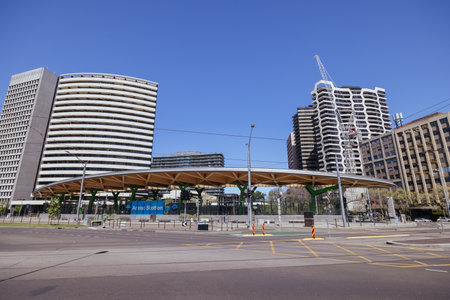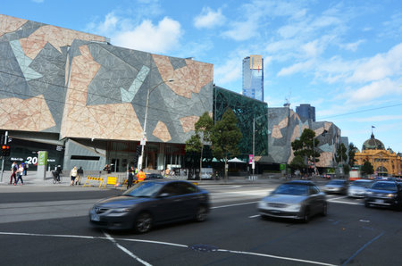 MELBOURNE, AUSTRALIA - OCTOBER 10, 2015: Iconic Federation Square on a dpring day. It is a mixed-use development in the inner city of Melbourne, covering an area of 3.2 hectares.