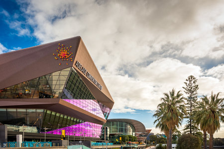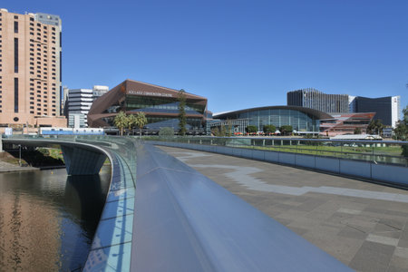 Adelaide, Australia - August 27, 2017: Adelaide Convenrion Centre after reconstruction viewed from Torrens river footbridge during winter time