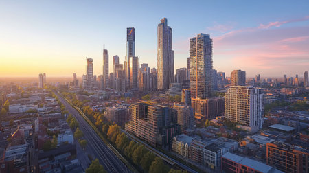 Experience the breathtaking beauty of Melbourne's skyline at sunset, casting vibrant colors over the river. This aerial view showcases the city's dynamic architecture, reflecting a perfect blend of urban life and nature.