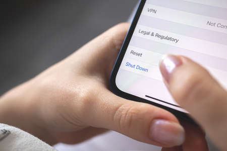 Person shut down the smartphone, mobile phone turn off concept photo, closeup