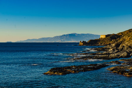 Spanish rocky shoreline. Mediterranean region of Villaricos, Almeria, eastern Andalusia.
