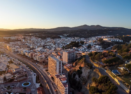 Aerial panoramic view of Arenys de Mar city at dawn. Located in El Maresme, Barcelona, Spain