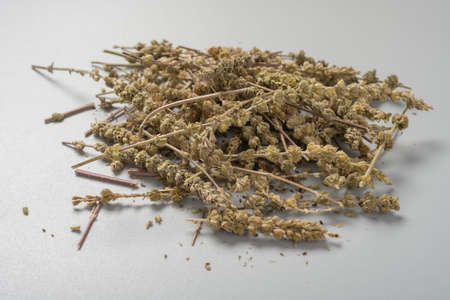 wormwood herb or in latin Absinthii herba herb in wooden spoon isolated on white background. medicinal healing herbs. herbal medicine. alternative medicine