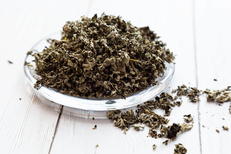 green dry crushed leaves (marijuana, tobacco) on a white surface