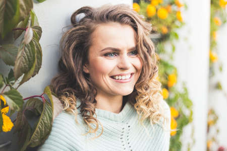 beautiful, fashionable, curly girl walks through the city. Joyful emotions on the face, smile, surprise, happiness. Beautiful smile with perfect white teeth on flower background.