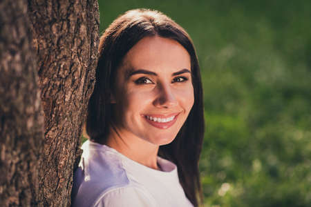 Close-up profile side view portrait of her she nice attractive pretty cute cheerful cheery brunet girl spending free time on pure green grass lawn country village vacation holiday