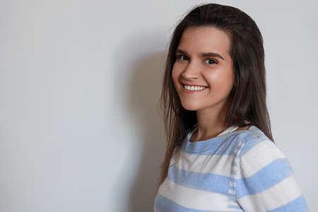 Portrait of beautiful young woman on white background, space for text