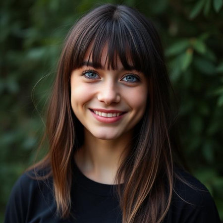 A young woman with long dark hair and green eyes looks off to the side, with a soft focus background of greenery and a glass structure.