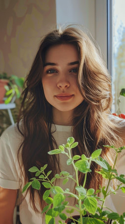 A woman with long brown hair is smiling and holding a plant. Scene is cheerful and positive