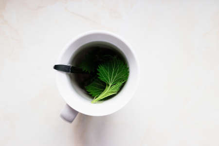 Green nettle tea in a cup. View from top. Low key light. Still life photo. White background. Simple motive.