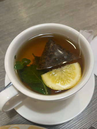 Cup of tea served with lemon and mint