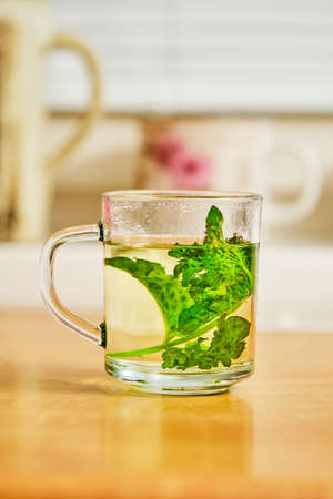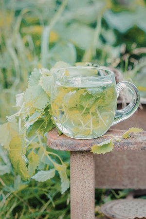 Fresh natural melissa , lemon balm herbal tea in glass cup.