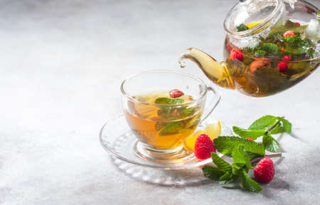 Pouring tfrom a teapot into a cup hot herbal tea with lemon, raspberries and mint. Healthy lemon tea.