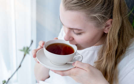 Young woman with a mug of tea in her hands sits near the window, space for text.