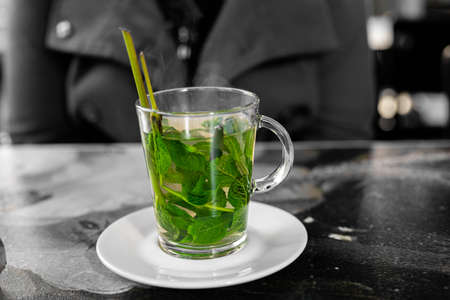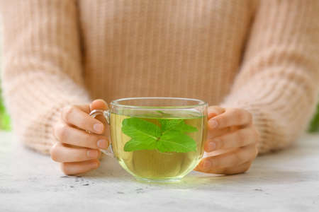 Hands of young woman holding a cup of hot mint tea or hot lemonade